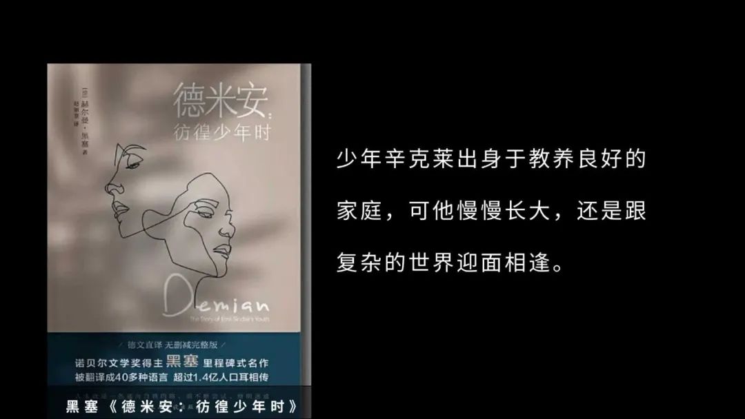 在《德米安》当中,黑塞把这个时刻叫做破壳,他把试图破壳的青年比喻成一个破壳的大鸟,他说他半个身子困在一个黑暗的球体中,一片湛蓝的天空下,他仿佛正从巨大的球体中奋争而出,这是充满了力量又精彩的一刻。打破蛋壳,我们才能够在走向自我的道路上更进一步。我觉得假如我们能够这样来分析青春叛逆期的底层逻辑,我们会同情一个孩子在自我意识刚刚萌发时候的困难,我们能够及时地给予他帮助。辛克莱说,我感觉我长出了一个跟别人格格不入的灵魂。很多孩子都会因为觉得我长出了一个跟别人格格不入的灵魂,跟群体不一样,跟大多数不一样,跟父母要求的不一样,他会感到很恐慌。但是我想提醒这些年轻人和少年,也许这正是你的自我在发芽,要懂得保护它。青春叛逆期这个词我不是特别认同,但是我愿意把它叫做青春成长期、青春探索期,当然也是青春困难期。