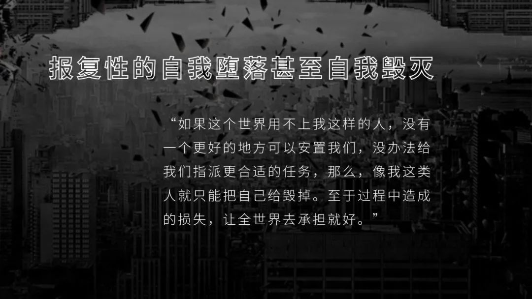 我没有办法杠别人那我就杠自己,我是个没用的人,我没有价值,我在这个世界上是多余的。辛克莱有一段愤怒的话,他说如果这个世界用不上我这样的人,没有一个更好的地方可以安置我们,没办法给我们指派更合适的任务,那么像我这类人就只能把自己给毁掉。至于过程中造成的损失,让全世界去承担就好了。如果一个青少年他得不到正确的引导,就有可能踏入的三种误区。所以这是非常非常艰难的一个成长时期。给青少年的几个建议