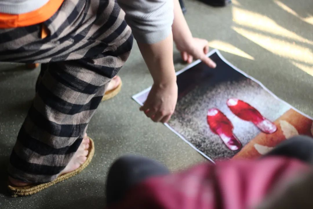 而这双拖鞋就是陪着她上下楼梯的一个很重要的生活物件。所以她的每日动作是拍摄了这双拖鞋的照片,并且打印了很多张,摆在不同的位置。