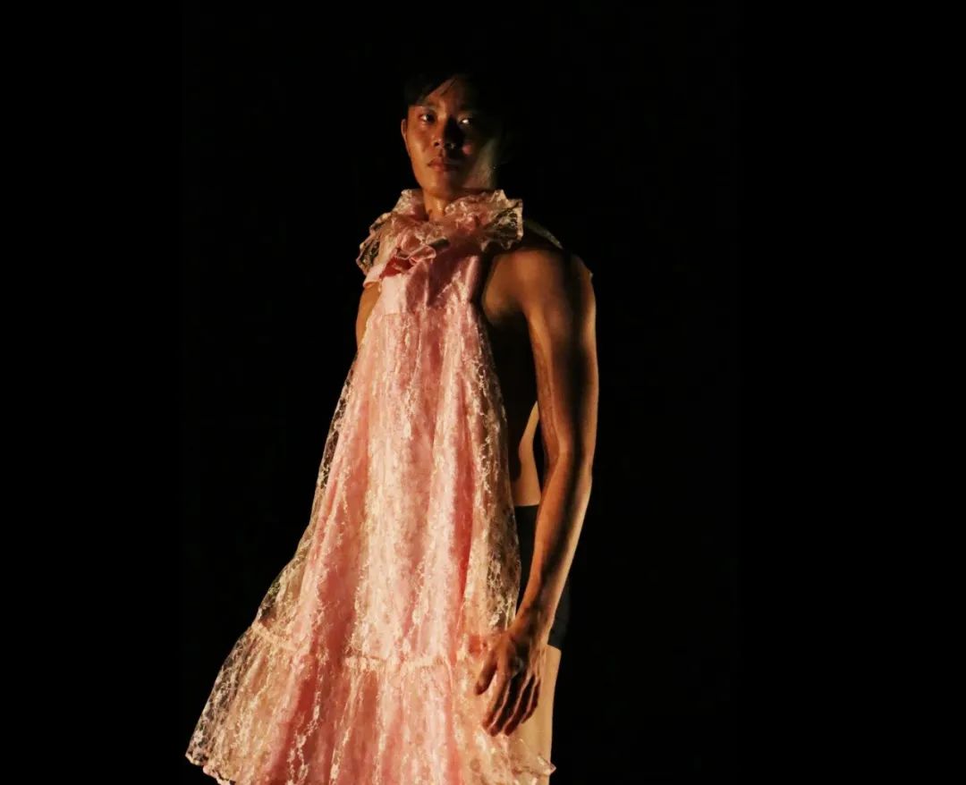 这位舞者是凯森(Kyson),是马来西亚华人。他的妈妈是马来西亚第二代华人,要很努力地学习,不能够去舞厅。他妈妈第一次跳舞是在婚礼的现场,所以他在作品里面也拿了他妈妈的婚纱,穿在身上跳了一段舞蹈。