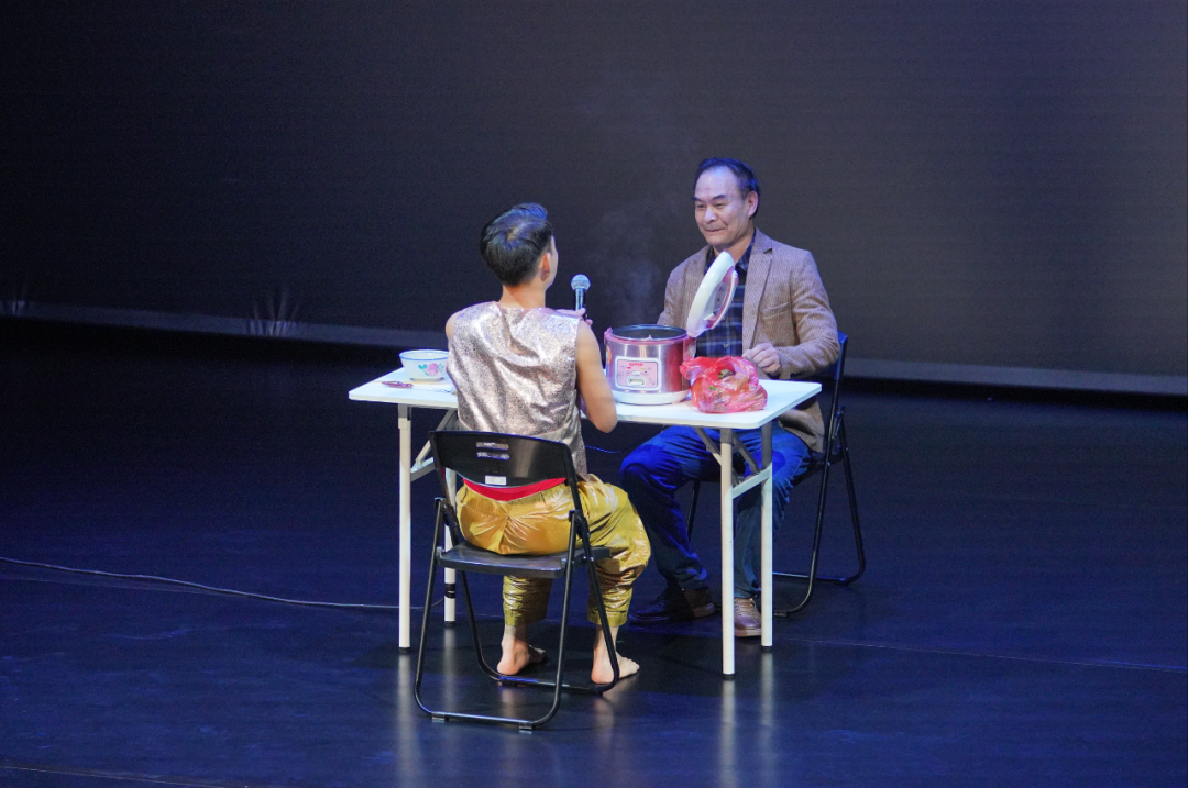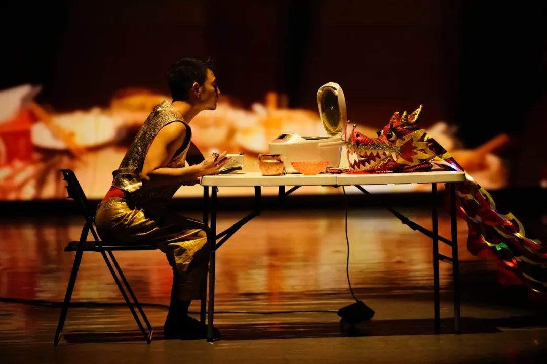 我问我爸,这些年我开始出现乡愁了,怎么办呢?他就教我煲汤。所以煲汤这件事情也出现在了舞台上面。因为在每一个华人家庭里,总会有一个电饭煲,有它的地方就有家。