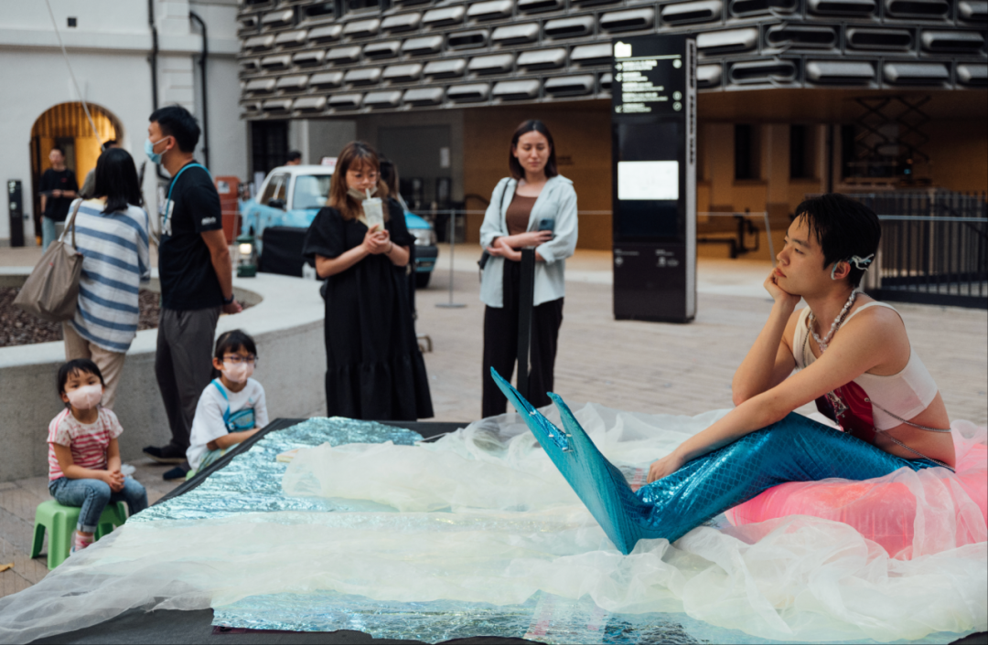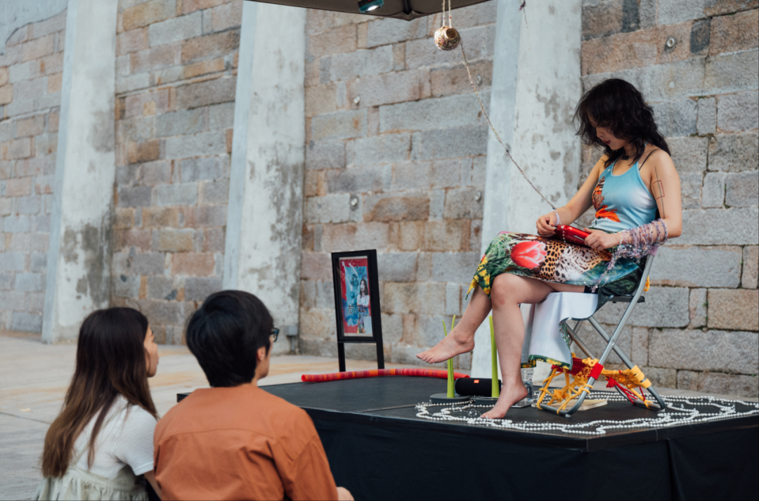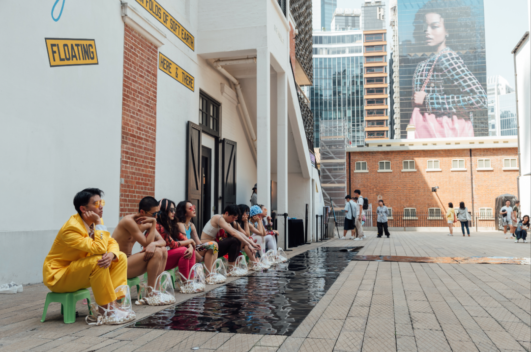 《蝴蝶岛》的演出分两部分,一部分在户外操场,一部分在剧场里面。我们的首演是在香港大馆,在中环那么消费主义的地方放着《一生所爱》,舞者在一个巨大的香奈儿广告下,静静地泡脚跟听歌,好像坐在广州火车站的候车厅里,脸上带着迷茫未知的表情,将要去到一个悬而未知的地方。
