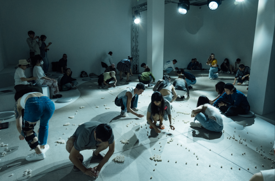 在整个演出里,我们用了很多在拼多多买的塑料珍珠。舞者不断地倒珍珠和捡珍珠,也唤起了观众的参与行为。所以到最后很多观众都蹲下来,开始把这些珍珠拼成不同的图案,然后用一颗颗的珍珠把彼此连接在一起。