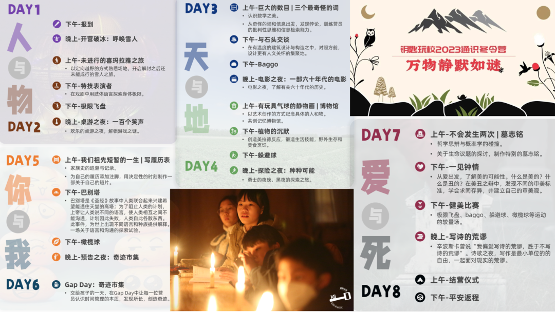 我们甚至可以把一本诗集做成我们夏令营的主题,这是辛波斯卡的《万物静默如迷》,你看到的每一个活动的名字都是一首诗的名字。