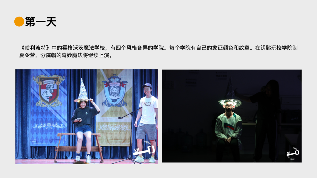 五湖四海的营员来到我们的营地里面,第一天还会戴上分院帽,像哈利波特的那个霍格沃茨魔法学校一样,进入到不同的学院里面去,然后他们就会经历这三个阶段的学习。