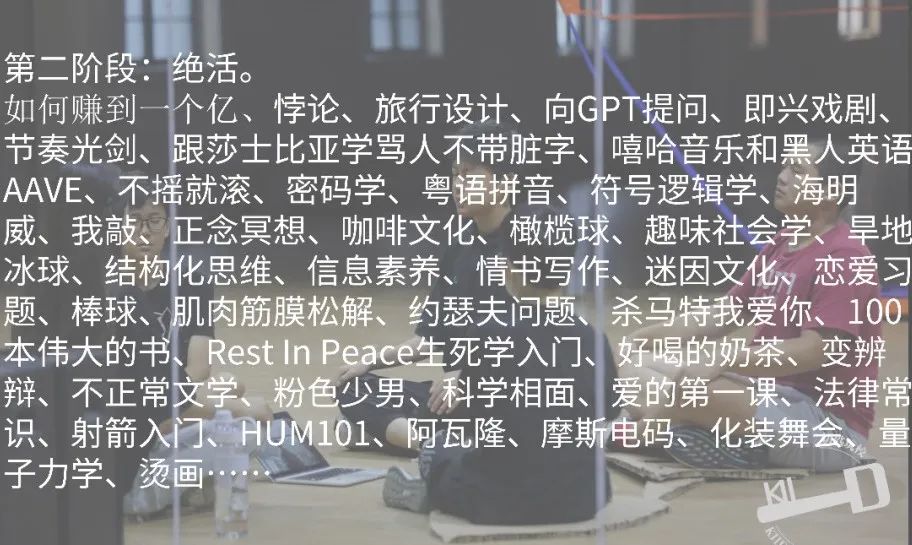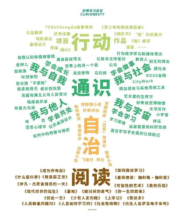 第二个阶段,我们所说的基本功是我们好奇学习社区的四种学习方法:阅读、通识、自治、行动,让学生慢慢地在这些事情里面积累一些立足社会必备的技能。