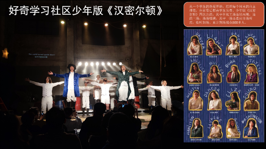 有一年她迷上了风靡全球的音乐剧《汉密尔顿》,从她一个人的愿望开始,她把我们所有人都卷进了这个项目里。那段时间在好奇学习社区每天你都能听到《汉密尔顿》的歌声,每个周末他们都加班加点的排练,而老师只在他们需要的时候才出现,完全是他们自己在做这个事情。