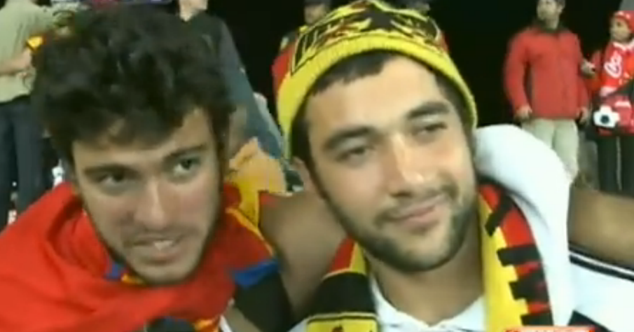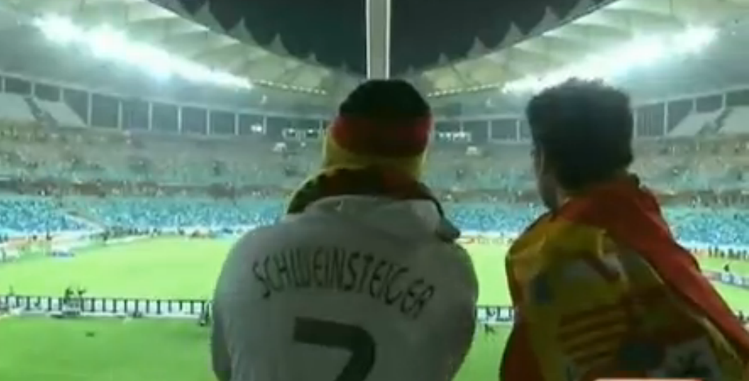 我们想多拍一些关于这场比赛赛后的观众场景,于是就去了看台。那个时候,比赛已经结束20分钟了,人已经走得差不多了。于是,我很自然地就发现了两个特别显眼的哥们:右手边的球迷披着西班牙国旗,左手边的球迷穿着德国国家队球衣。