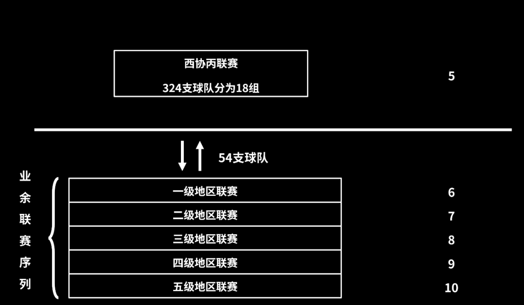 再往下就是小杜所在的西协甲,也就是第三级别联赛。在这个级别的联赛有40支球队,分两组进行比赛。职业序列到这里还没有结束。还有两个级别,西协乙和西协丙。第五级别联赛还是在职业序列内,它被分为了18个组,总共324支球队。看球的朋友会知道这是一个多么庞大的数字。