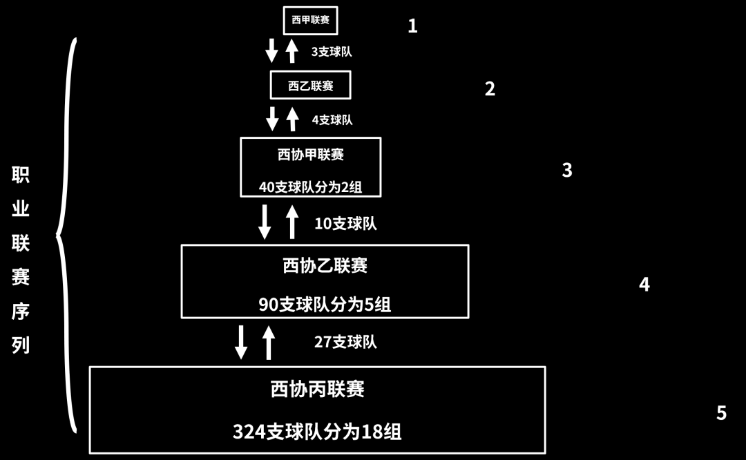 各级联赛分别进行整个赛季的所有比赛后,西甲联赛的最后三名球队会降到第二级别联赛,第二级别的前三名会升到西甲联赛,以此类推,这就是一个联赛金字塔的运转体系。