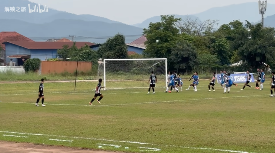 还没到中国,我去的是老挝。我们来看看老挝的足球是什么样的。这是老挝职业联赛的球场。