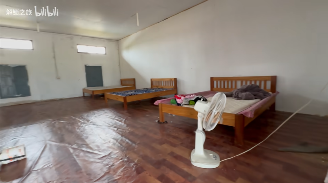 因为他是球队里三大国脚之一,所以他有特权可以住单间,不过是三个球员一起的单间。这个房间没有被清理过,就是他们日常住的场景。没有家具,但是有电器——一台风扇。