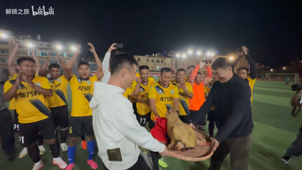 跟我一起去拍摄的是曾经进过国家队的杨昊和王新欣,那天受邀给边超的冠军颁奖。在边超赢球有官方奖励,他们那场赢球的奖励是一个牛头,不是一头牛,而是一个牛头。偶尔他们还会送蜜蜂,不是蜂蜜,是一箱蜜蜂。一切都充满着乡土情。拿到牛头,回家一煮就可以跟队友喝几杯了。