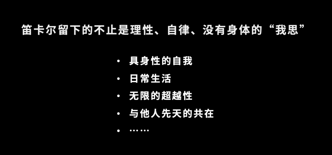 比如说他会说,“我”其实不仅仅只是没有身体的,同时,我跟我的身体又是融为一体的,我具有一个鲜活的内在感觉,这种感觉告诉我,我就是有一个身体,我就是在疼着,我疼痛这件事情,不要用理性去审判它,就让我尽情地接纳它,接纳我有一个身体这件事,所以这也是笛卡尔哲学之中,隐藏的另外一条线索。