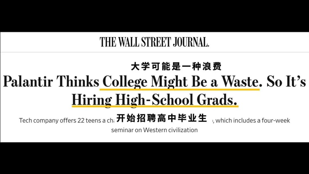 最近,美国硅谷的Palantir(被称为“最神秘的公司”)做出了一个决定:他们的某项招聘,将不再面向大学生,而是面向高中生。在他们看来,现在读大学已经是一种浪费。这家公司的CEO是哲学博士😂,他有反思的意识,他意识到“大学过时了”。