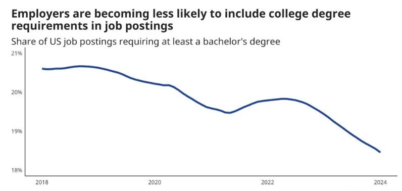 这是世界上最大的招聘搜索引擎的数据:从2018年到去年,招聘机构要求“大学学历”作为硬性指标的岗位数量在稳步下滑。