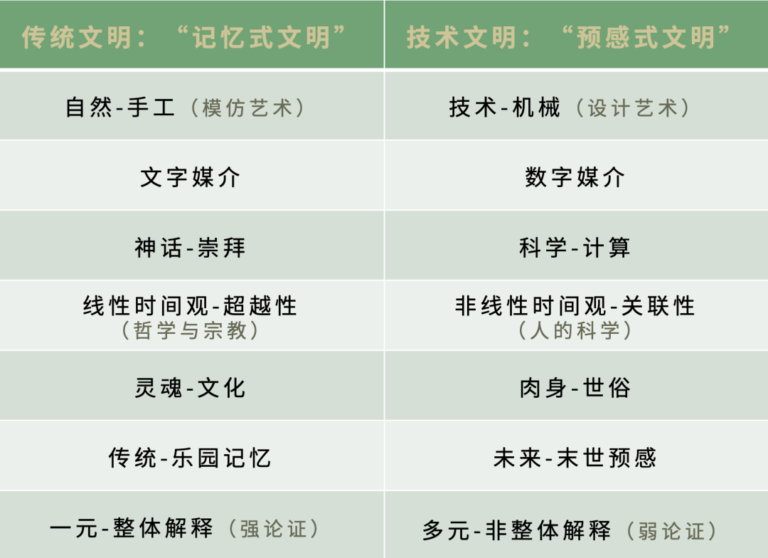 海德格尔的学生安德斯就说,这是「绝对虚无主义」。它完全印证了尼采在1884年提出来的「上帝死了」。尼采当时只是想说传统哲学、传统宗教出问题了,不再能发挥它的有效影响力。但现在我们可以进一步说,一个技术统治的时代到了。传统哲学和宗教所提供的超越性确信,已经慢慢消失了。以上我所说的这些现象,其实都说明了文明的巨大变局,也就是自然人类文明向技术人类文明的切换。传统文明主要的媒介是文字、书写,但今天是文字、声音、图像三个基本媒介的并存,它们进入到了一个权重的重新配置。我认为这是好事,表明我们人类生活变得越来越丰富。虽然对我来说很致命,我的书卖不出去了。另一个问题是全面的数字化。无论是文字媒介、声音媒介还是图像媒介,都已经变成了数字媒介。人类在线的时间从1981年的不到0.01%,放大到了2024年的60.76%。这个数据意味着,听课的时间没有了,跟家人相处的时间没有了,阅读的时间没有了,我们全部进入在线状态。对于文明的巨大变局,我把它叫作「从过去记忆向未来预感」的革命性变化。传统文明大概可以叫作「记忆式文明」,记忆很重要,历史很重要,传统很重要;而技术文明是「预感式文明」。今天人类生活的大部分问题,都是在这样的纠缠里产生的。传统文明是自然手工的,它艺术的基本样式叫模仿艺术,媒介以文字为主;而今天的文明是技术的、机械的,媒介已经转换为数字媒介。传统文明是神话崇拜的。我从小是听着鬼故事长大的,鬼神对乡下生活来说十分重要;但今天的文明是科学计算的。传统的自然文明始终强调「灵魂」文化,认为灵魂、精神是第一位的,肉体、身体是丑陋的,是灵魂要逃离的地方,所有传统宗教都是这样假定的;但今天我们已经进入到了一个肉身的、世俗的文明当中。我们认为身体很重要,没有身体哪来的灵魂?「身体」成为了二十世纪哲学的根本性主题。对于传统文明来说,我们始终有个「乐园」的记忆,觉得过去太重要了。我们总说中国的先秦文明特别好,后来越来越烂,今天是最烂的。这种模式我把它叫「乐园模式」。真的是这样吗?当然不是。孔子那个时代生活很糟糕的,人都活不到三十岁,博士还没毕业就死了。而今天我们的寿命越来越长,能活到80岁,在座各位大部分人,你们将活到150岁,我现在有把握地说这个话。对技术文明来说,我们的目标不再是过去,我们的定向是未来。于是产生了很多「末世预感」。比如英国物理学家霍金说我们只有一百年了,他说这个话的时候是七八年前,也就是我们现在还剩下九十年,不多了。传统的文明,哲学也好、宗教也好,总是希望提供一元的、整体的解释,是一种强论证;但是今天的技术文明,它提供的是一个弱论证,是多元的、非整体的解释。我们现在已经不要指望对这个世界、对一个事件做出单一的、统一的、整体的解释。更可怕的一点是什么呢?今天的文明是传统文明和技术文明纠缠在一起的结果,所以变得更加地令人头痛。海德格尔在上世纪三十年代预言了我们今天的文明,他用了三个词:快速、计算、巨量。今天我回过头看,这个哲学家还是蛮牛的。今天的文明其实是一个碎片的世界,世界趋于碎片而多样,变得更加梦幻、更加丰富,这是好事,但我们无法为它提供整体的、统一的解释。与之对应的就是多元尺度——单一尺度和唯一真理已经失效了,观念之争成为时代的常态。国家与国家、民族与民族、人群之间、个体之间,我们不断地在争论,实际上都是观念之争。因为你总是用单一的标准去要求别人,所以你无法容忍。但是好好想,你自己也经常自相矛盾。其实你应该容忍这样的矛盾,因为我们无法提供单一的尺度了。现在有个概念叫「去未来化」,意思就是未来这个维度仿佛就在当下,混乱的当下和无法确定的未来粘连在一起,个体的精神压力无比地大。今天我们讲快乐。那么在文明的大变局之下,快乐去哪了呢?我们的许多快乐正在消失、被取代。首先是跟身体和感官相关的快乐,我举出几个: