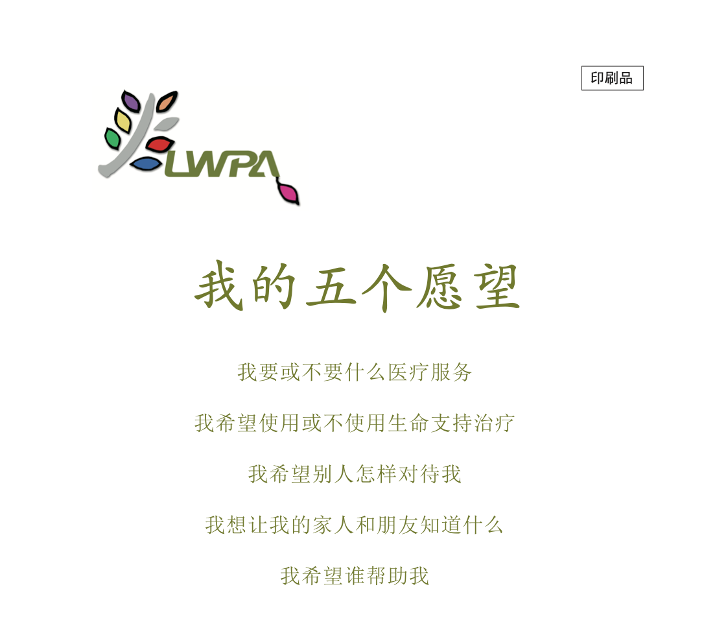 这五个愿望分别是:我要或不要什么医疗服务;我希望使用或不使用生命支持治疗;我希望别人怎么对待我;我想让我的家人和朋友知道什么;以及我想要谁能帮助到我。