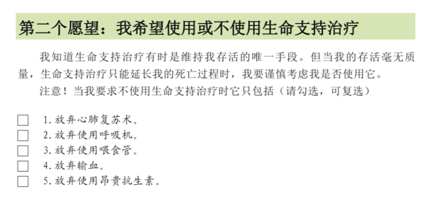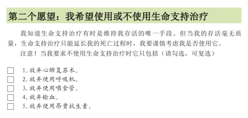 每个愿望下边分别有好多个子选项,比如说第二个愿望下边就有五个子选项,分别是放弃心肺复苏、放弃呼吸机、放弃胃食管、输血,或者放弃使用昂贵的抗生素。