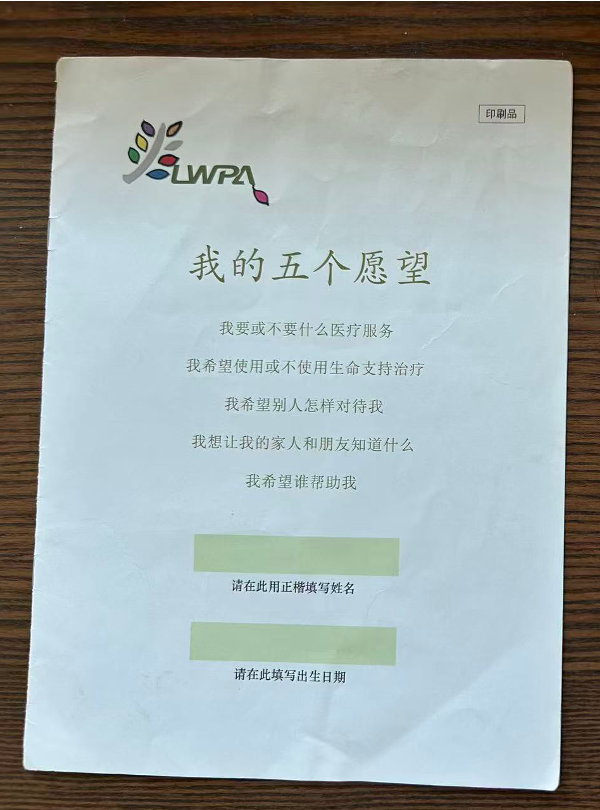 可能大家有的人没有听过生前预嘱这个概念。生前预嘱,它是指人们事先,也就是在健康或者意识清醒的时候签署的,说明在不可治愈的伤病末期或临终时要或不要哪种医疗护理的指示文件。不同国家和地区的生前预嘱会略有一些差别,这个网站上的生前预嘱叫《我的五个愿望》。