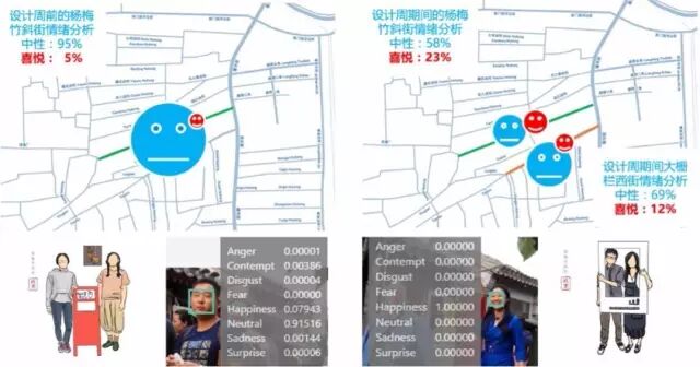 通过这个方式,我们其实做了一个很有意思的比较。在杨梅竹斜街,我们发现在北京国际设计周之前,这条街上只有5%的人是喜悦的,95%的人走路是面无表情的。在“十一”的时候这里成了设计周的一个展点,有非常多的文化活动和展览,所以这时候街上有23%的人是喜悦的,只有58%的人是面无表情的。