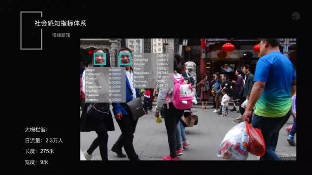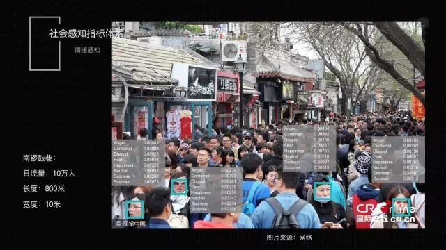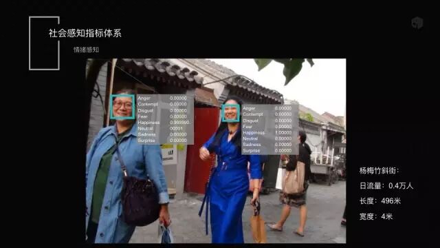 那怎么去了解市民的情绪呢?第一种方法,通过图像。我们把一些摄像头拍到的和一些照片抓取下来,然后分析这些照片。比如说这是北京的南锣古巷,一个很有名的旅游景点,也是历史文化街区。这条800米长的胡同,在高峰日的时候一天会有10万的人流量。然后我们开始去分析这些面孔。