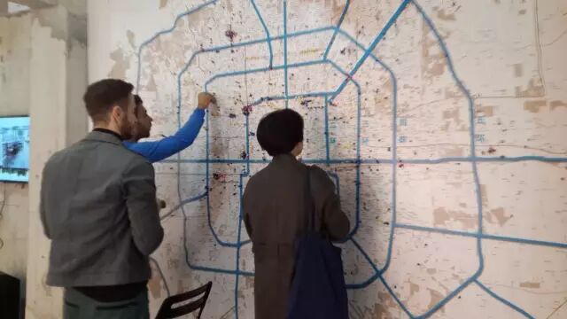 然后就有非常多的参观者帮我们在墙上扎针,有一些地点被扎得最后放不下针头了。比如说像北京的CBD、北京站、北京西站、传说中的西直门,都是公众认为非常不好走路的地点。