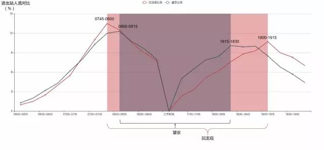 我们发现回龙观的居民早高峰来得更早,七点四十五就到达早高峰,而望京的早高峰来得更晚。下班更明显。从五点一刻开始,就有5%的望京居民刷卡回家了,这时候只有2%的回龙观居民才回家。到六点一刻的时候,望京的返程高峰就到达了。六点四十五望京的人基本上陆陆续续都回完家了,高峰就过去了。七点一刻开始,回龙观的人陆陆续续开始回家了。