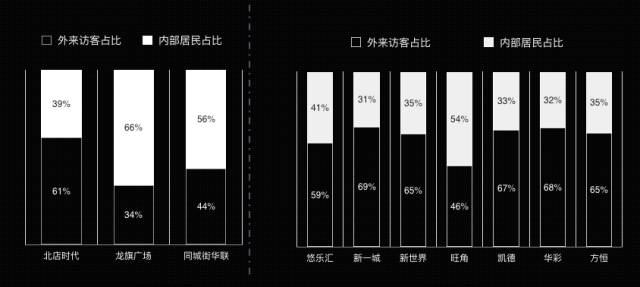进一步来看,右边这些望京的商场,60%的客流都来自于望京外部。也就是望京的商业的等级比较高,它能够吸引外面的人到望京去消费。左边是回龙观的商场,60%都是本地的客流。我们可以看到它的商业等级的差异。