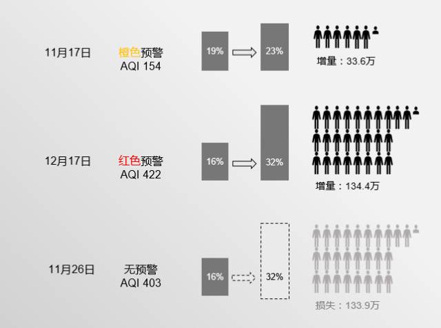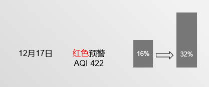 12月17号,在它的头两天12月15号政府发布了一次红色的雾霾预警。12月17号这一天,AQI是422。按照我们的测算,本来只应该有16%的人戴口罩的,这一天实际上有32%的人戴口罩。