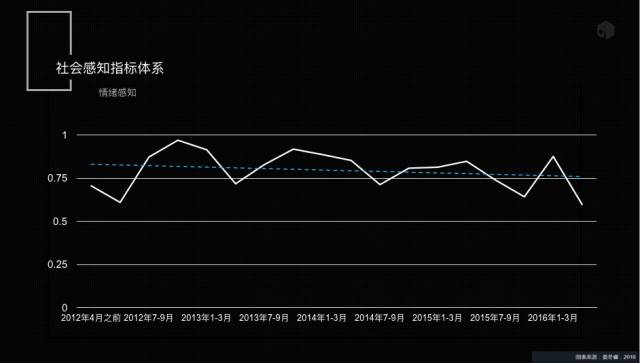 那我们就开始寻找另外一种方法去感知空间的情绪。还是跟刚才东四的那个社会感知的方法一样,我们通过语意。这是关于一个景区的。我发现这个景区的游客的情绪是规律性地波动的,从2012年到2015年,他们总是在某些时刻情绪低落,某些时刻情绪高涨。我们发现他情绪好的季节是冬季,尽管冬季游客很少,而情绪最差的是夏季。