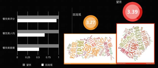 再来看一下两个地方的餐饮。回龙观,你可以看看他们主要的餐饮结构:简餐、小吃、粉面、快餐。望京是韩国料理、火锅、烧烤、面包西点——大家可以看到差异。从点评的评分、点评的人均消费价格、设施的密度、业态多样性上面来说,回龙观的餐饮简直……唉。