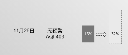 11月26号这一天政府没有发布雾霾预警,但这一天的AQI高达403。这一天实际上只有16%的人戴口罩,但是如果政府发了雾霾预警短信的话,应该有32%的人会戴口罩。