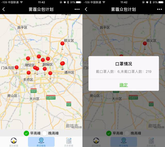 这是我们同事在微信上开发的一个小程序,叫雾霾众包计划。这就是某一天志愿者给我们标的点以及他所观测到的人数。这几天人数很少,因为前一段时间北京开两会。