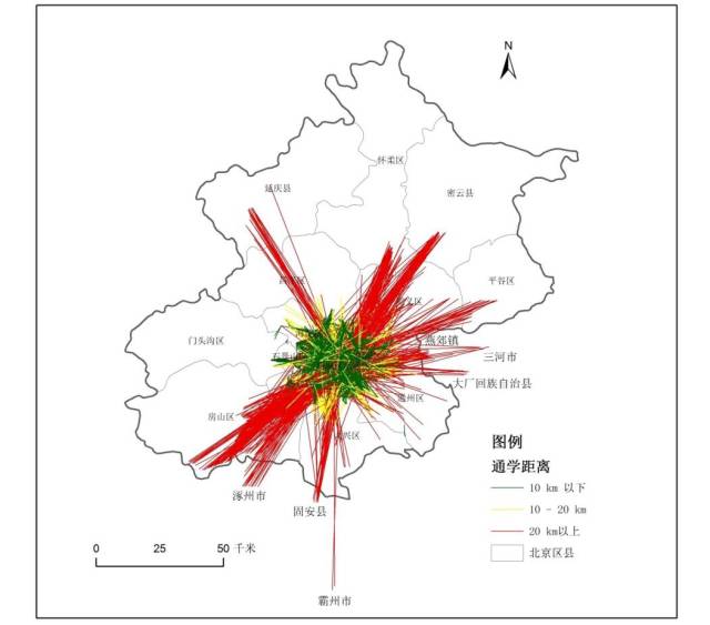 除了能够看到这些灰色人群,我们还可以看看学生。北京有很多学生乘坐公交车去上学,我们把北京的重点中小学周边站点的刷卡记录提出来,去看看这些学生的刷卡记录。我们惊讶地发现了这张图。这些红色的线代表了20公里以上的上学出行,黄色的代表10公里,绿色的代表5公里。我们发现,有很多孩子会乘坐20公里的公交车去上学。