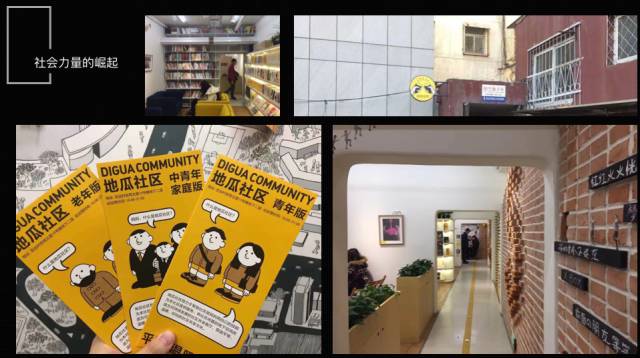 而我们又看到另外一些力量。这是周子书在北京亚运村附近的地下室所做的一个叫“地瓜社区”的改造。他和社区的居民一起将这样一个传统的或者大家会认为没有品质、没有尊严的地方——居民楼的地下室,改造成了一个为社区服务的、有品质的、能够给市民找到尊严的地方。