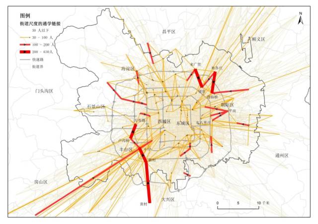 这是这些重点中小学的主要的择校方向,比如说来广营的人会跨学区通学到望京去上学;比如说大兴的孩子会跑到丰台去上学。当然我们不知道他们是怎么实现这种择校的,但是通过刷卡记录是能够看到这种跨学区的孩子的出行行为。