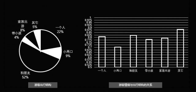但是这不是最好玩的,最好玩的是这个——我们发现游客的出行结构也跟情绪有关系。通过对游记的分析我们发现,如果你是一个人或者和好基友一起去,情绪都还不错;但是如果是两口子去的话就不是那么好。其实这个给我们一个线索:也许这个景区在旅游的配套服务上面,对于家庭出游考虑得不是那么多,可能服务没有跟上。